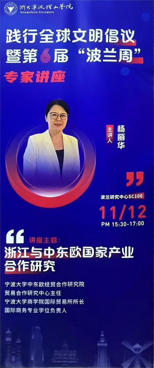 2024年11月12日,践行全球文明倡议暨第六届“波兰周”系列活动在浙大宁波理工学院波兰研究中心召开。本次活动由浙大宁波理工学院、波兰驻上海领事馆主办、教育部国别区域研究基地波兰研究中心、国际交流合作处、宁波市阳明文化创造性转化与传播基地、中国语言文字(浙东文化)传承推广基地共同承办。我校MIB负责人杨丽华教授应邀出席本次活动并做专题讲座。